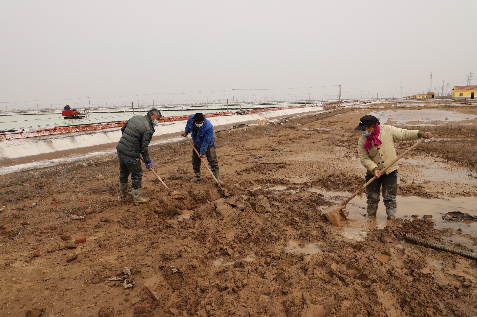 3月28日清晨,在通往日曬制鹽新河、埒南分公司入口處,戴著口罩的工人們依次接受測溫、亮碼、登記,有序進入各生產(chǎn)班組。灘頭上,工人們分散作業(yè),忙著修補塑造、整理廩基……無論是從灘頭到塘頭,還是從碼頭到田頭,處處都呈現(xiàn)出熱火朝天、大干快上的場景。