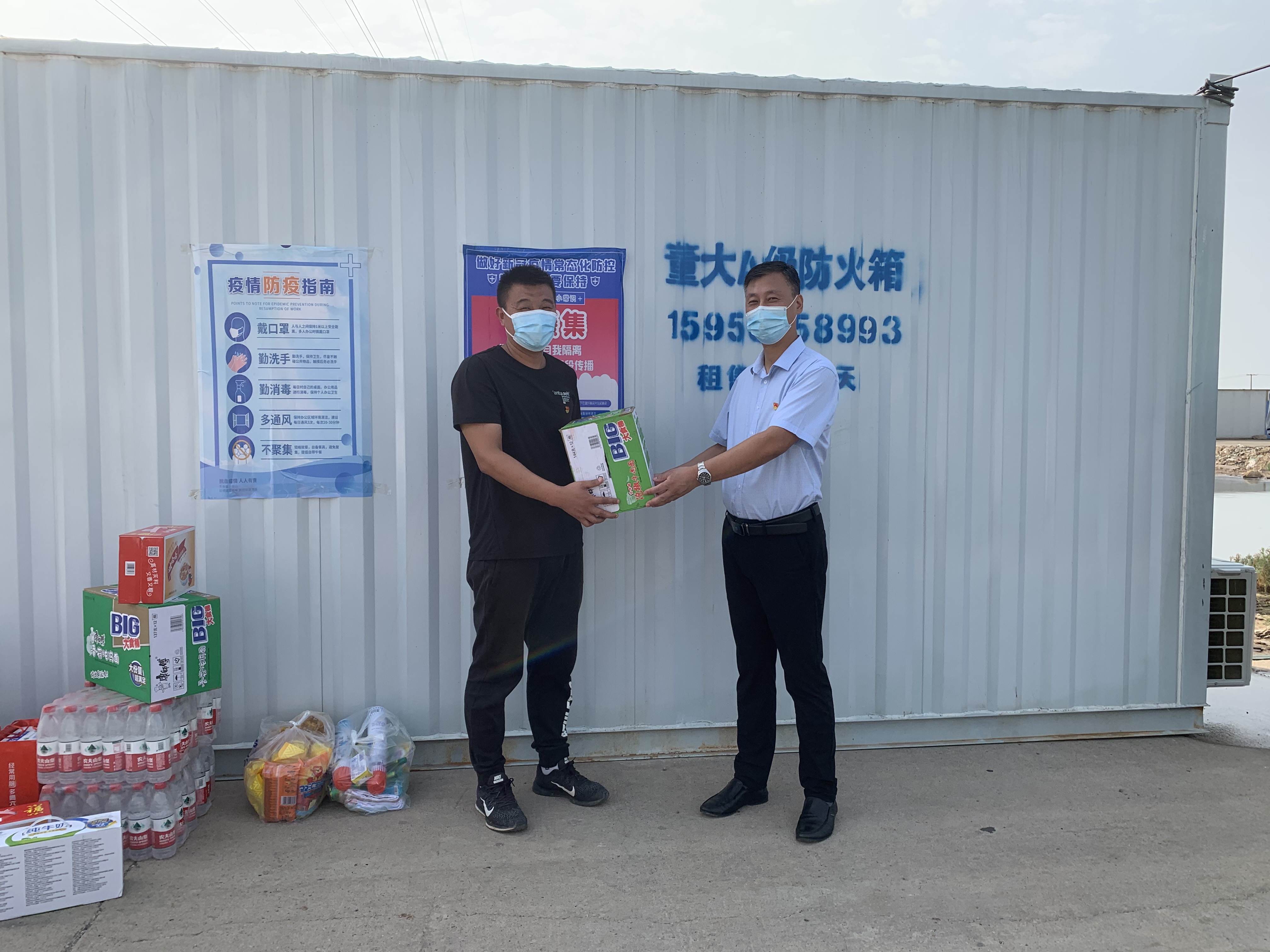 在各個路口卡點,公司領(lǐng)導(dǎo)向始終堅持在疫情防控一線的工作人員及志愿者們致以親切問候和衷心感謝,叮囑大家要強化自我防護,嚴(yán)格按照標(biāo)準(zhǔn)、程序、規(guī)范做好疫情防控工作,攜手共筑防疫屏障,并親手為他們送上、牛奶、八寶粥、方便面、蚊香等慰問物資。(西工