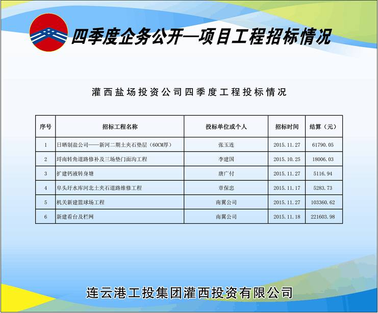 四季度灌西共開工建設6個工程項目,分4次由投資公司招標領導小組采用公開邀標形式進行了招標。
