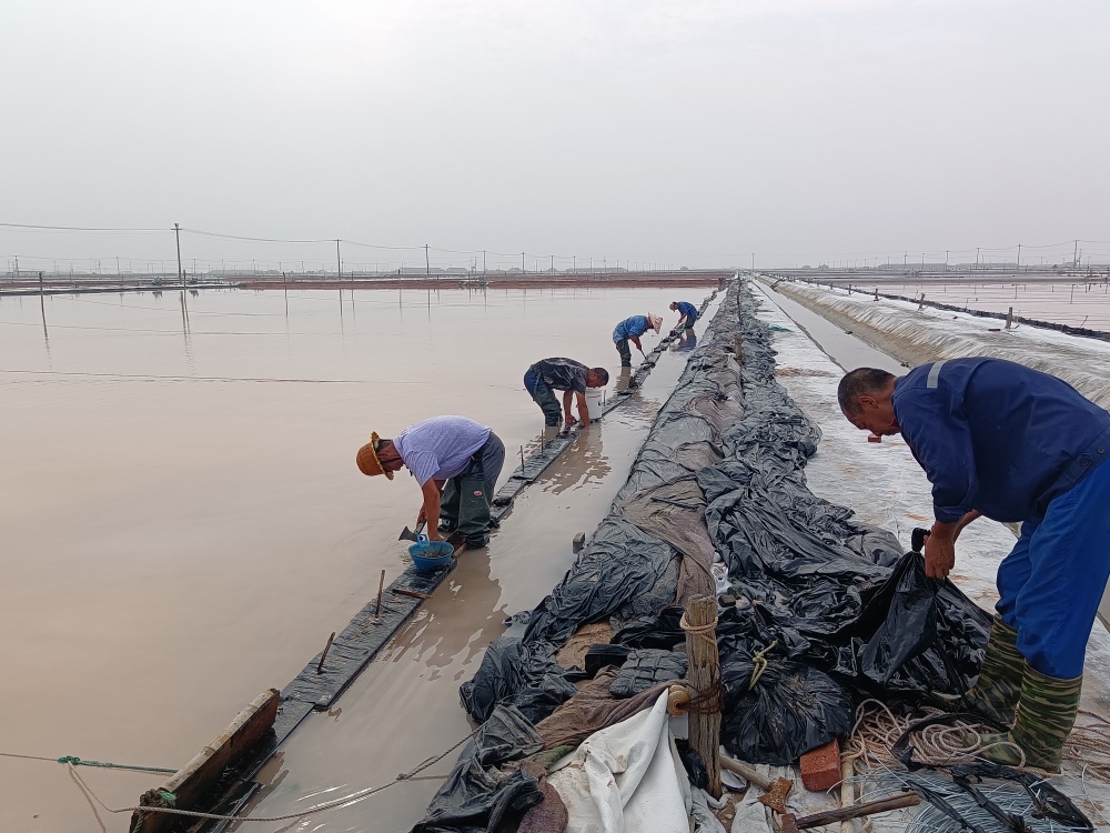 新河制鹽分公司統(tǒng)一安排和調(diào)配,利用夏季短晴天期間、打時(shí)間差的方式,對(duì)各班組塑布進(jìn)行更換更新。班組人員有的加固浮板,有的釘釘子,有的拆裝鐵釘,有的制作擋浪布小站樁。乒乒乓乓的敲打聲不絕于耳,一派忙碌景象,為確保原鹽生產(chǎn)能安全度過雨季打下堅(jiān)實(shí)基礎(chǔ)。(新河黨支部)