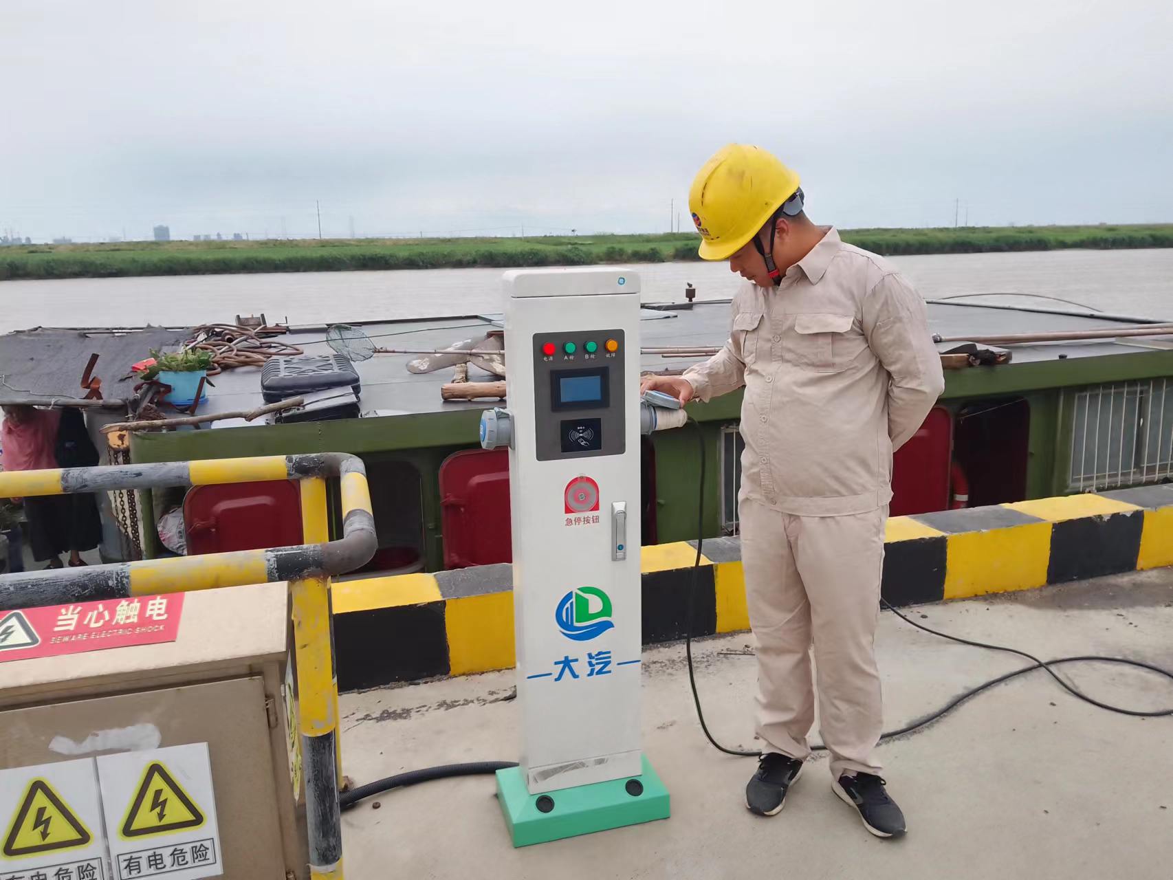 為了方便船只用上綠色環(huán)保電,宵洋物流公司在岸電基礎(chǔ)上進(jìn)行升級(jí)改造,投資4萬(wàn)余元,安裝5個(gè)岸電配電系統(tǒng),以替代柴油發(fā)電,從而降低船只停靠時(shí)間,消耗廢氣排放和嗓聲污染,每個(gè)電樁上帖有操作說(shuō)明書(shū)和注意事項(xiàng)等溫馨提示。接上專用電源,插入岸電接口,掃碼啟動(dòng)即可使用,安全高效,降低安全隱患。