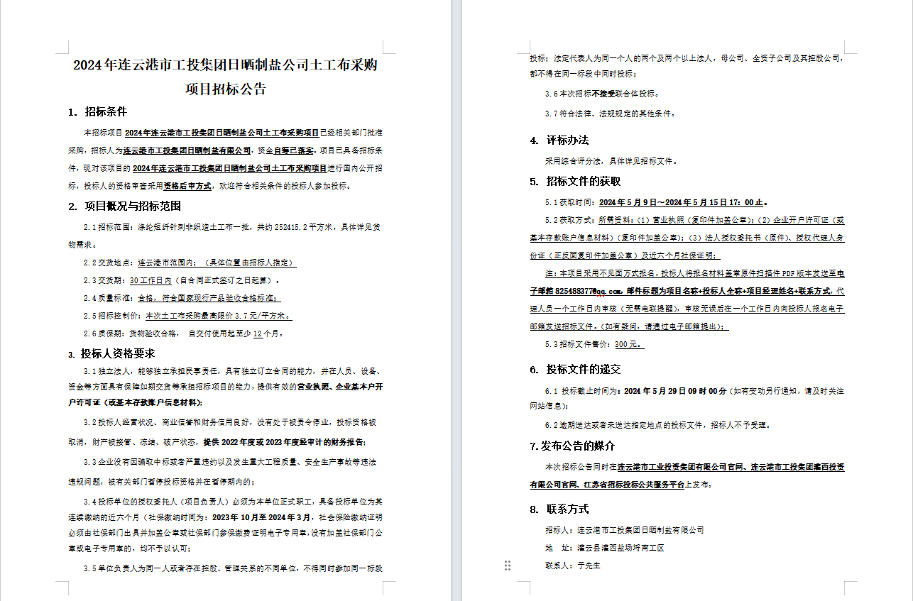 2024年連云港市工投集團(tuán)日曬制鹽公司土工布采購項目招標(biāo)公告