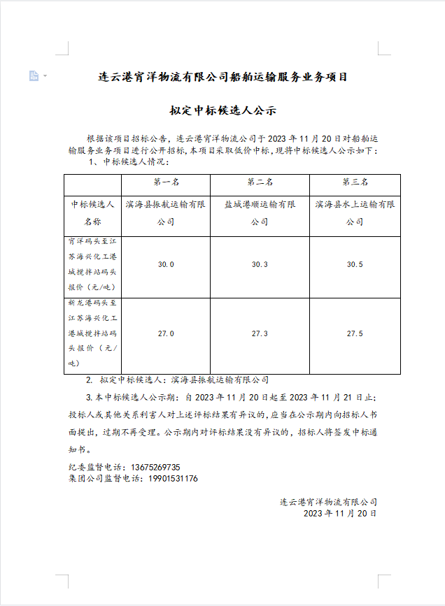 連云港宵洋物流有限公司船舶運(yùn)輸服務(wù)業(yè)務(wù)項目擬定中標(biāo)候選人公示