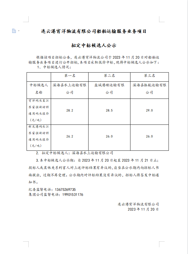 連云港宵洋物流有限公司船舶運(yùn)輸服務(wù)業(yè)務(wù)項(xiàng)目擬定中標(biāo)候選人公示