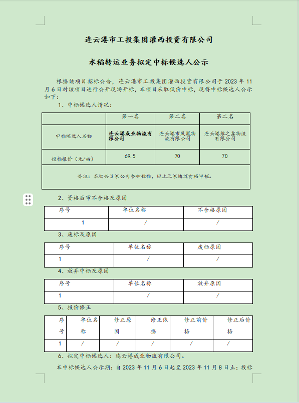 連云港市工投集團灌西投資有限公司水稻轉(zhuǎn)運業(yè)務(wù)擬定中標(biāo)候選人公示