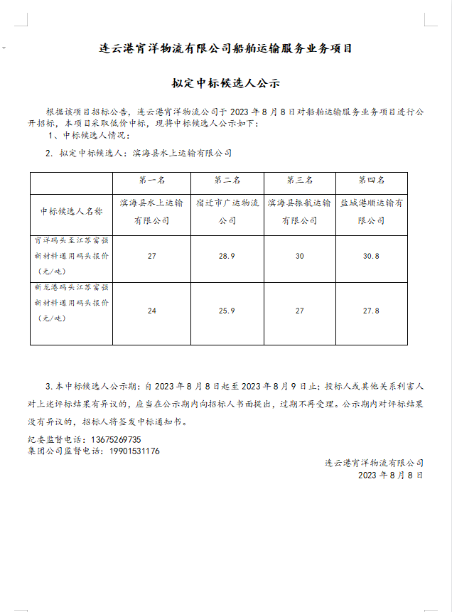連云港宵洋物流有限公司船舶運輸服務(wù)業(yè)務(wù)項目擬定中標(biāo)候選人公示