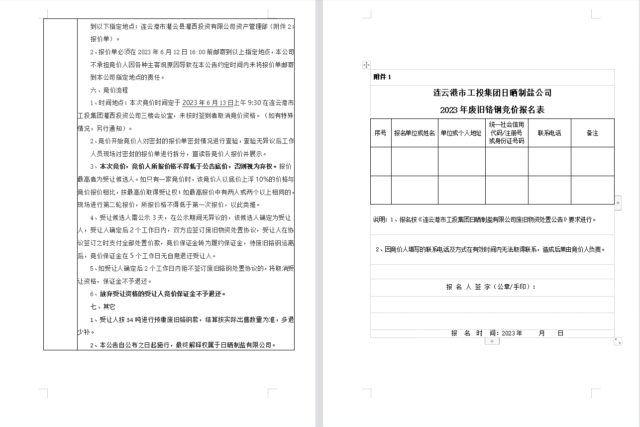 連云港市工投集團(tuán)日曬制鹽有限公司廢舊鉻鋼處置公告