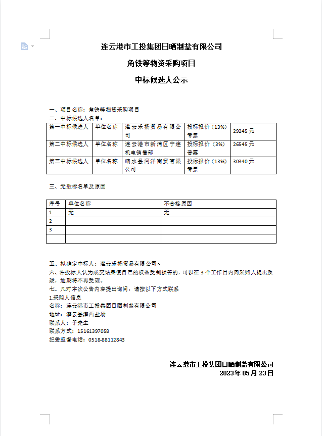 連云港市工投集團(tuán)日曬制鹽有限公司角鐵等物資采購項目中標(biāo)候選人公示