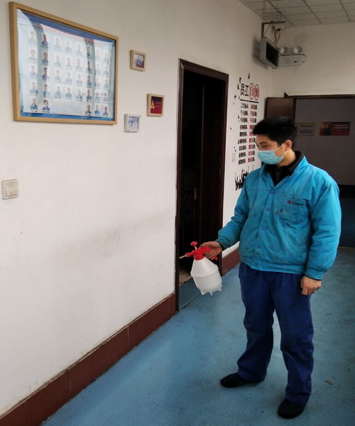 孫正柱為辦公樓入口進(jìn)行消毒