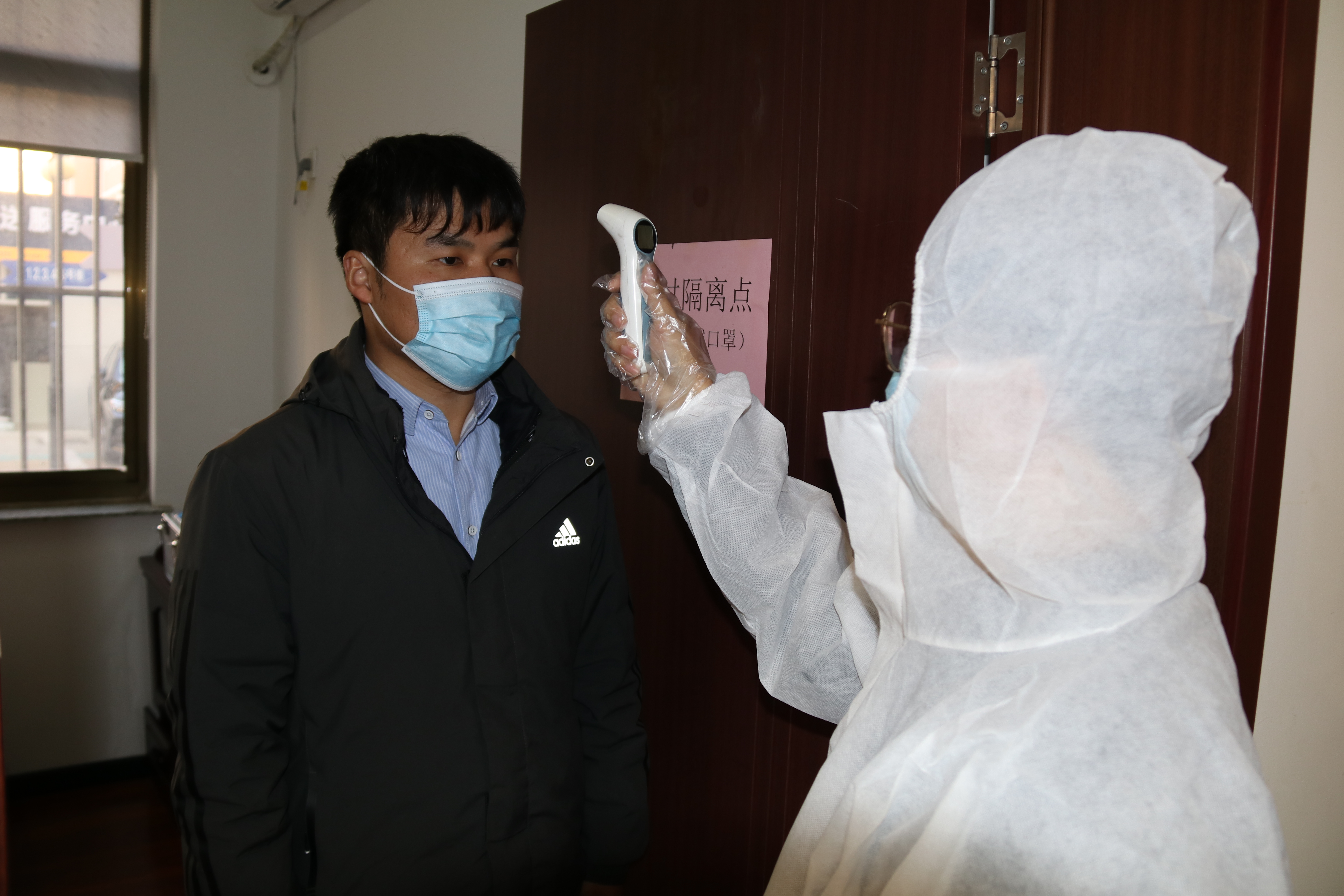 處置組成員將體溫異常者帶至臨時(shí)隔離點(diǎn)。