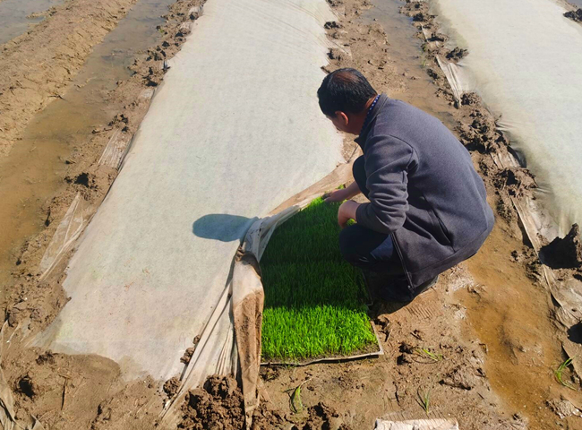 近期,大新農(nóng)場(chǎng)組織對(duì)自營農(nóng)田機(jī)插秧集中檢查,目前秧苗生長正常已達(dá)到1.5-2葉秧齡。由于天氣良好溫度持續(xù)上升,預(yù)計(jì)5月下旬即可揭開無紡布進(jìn)行秧苗管理,6月上旬開始插秧。(劉 楊)