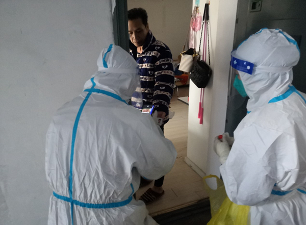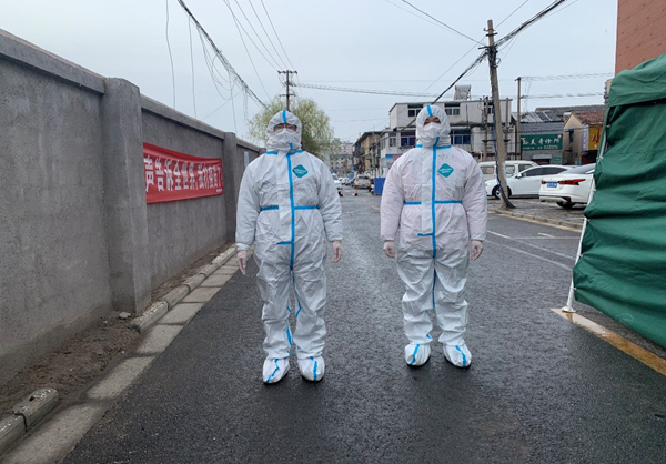 公司員工范益楊、李夢(mèng)達(dá)是集團(tuán)抗疫志愿隊(duì)的隊(duì)員。在冷冽寒風(fēng)中,他倆身穿防護(hù)服挨家挨戶(hù)通知商戶(hù)暫停營(yíng)業(yè),同樣的通知話(huà)語(yǔ)不厭其煩的重復(fù)著一遍又一遍,說(shuō)得口干舌燥、疲憊不堪也未能阻攔他們繼續(xù)前進(jìn)的腳步。