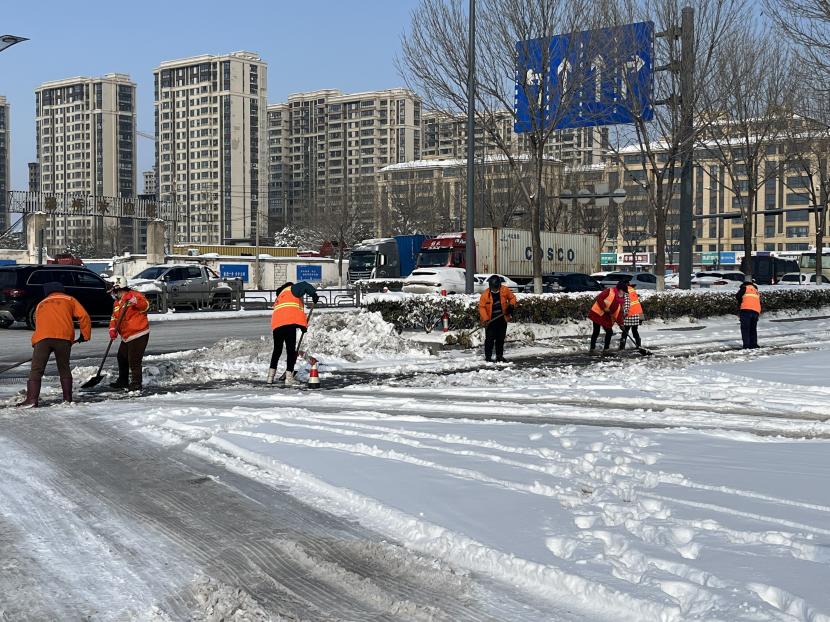5日凌晨4點,該公司負責人于廣華已經(jīng)在除雪的第一線,積極安排工作調(diào)度,對新光路、平山路、黃海大道等重要路段突擊清掃,大家頂著風雪,齊心協(xié)力,分工明確,高效配合,全力清除路面上的積雪和暗冰,及時為車輛和行人清理出一條條“安全路”。