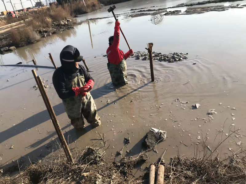 管道巡查發(fā)現(xiàn)通往堿廠的鈣液輸送管道因天氣影響爆裂損壞在送水道泥水中,搶修難度陡然增大。在困難前,我們干事豪情直面挑戰(zhàn)、創(chuàng)業(yè)激情燃燒嚴(yán)寒,穿上臃腫的防水皮衩深入到齊腰深的冰水中,卷起袖子雙手在水下摸索著對(duì)接管道,擰緊哈弗節(jié)上的每一根螺絲,接下來的打樁捆綁固定一切皆是那么的嫻熟。什么寒風(fēng)侵肌、冰澈透骨全然阻擋不住我們“鐵軍”干事創(chuàng)業(yè)的激情,鏗鏘有力的大錘不斷打下新一年的希望。