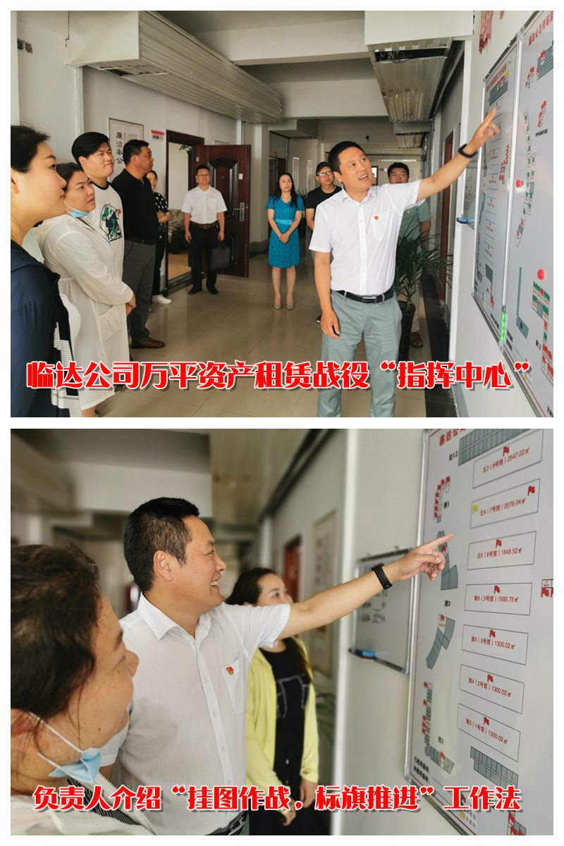 “分解任務(wù),每天出租180平方,我們用掛圖作戰(zhàn)工作方法,在困難中找優(yōu)勢(shì),在優(yōu)勢(shì)中找方法,將集中資產(chǎn)劃分片區(qū),分而治之,實(shí)行一個(gè)片區(qū)一個(gè)目標(biāo)導(dǎo)向,一個(gè)片區(qū)一個(gè)工作方法”“臨鋒而行,達(dá)道致遠(yuǎn),這是臨達(dá)公司的立企宗旨,我們是這么喊,也是這么干的”“臨達(dá)的年輕同志們是我們能夠突破7200平方任務(wù)的秘密武器,他們上門商談至天黑,周六周日讓他們休息都不休息,依然堅(jiān)守崗位跑市場(chǎng)”在臨達(dá)公司的“作戰(zhàn)指揮中心”,聽(tīng)取負(fù)責(zé)人杜洪波的介紹后,參加采風(fēng)的同志都忍不住豎起大拇指為先拔頭籌,超額超時(shí)完成任務(wù)的臨達(dá)全體“指戰(zhàn)員”點(diǎn)了個(gè)贊。