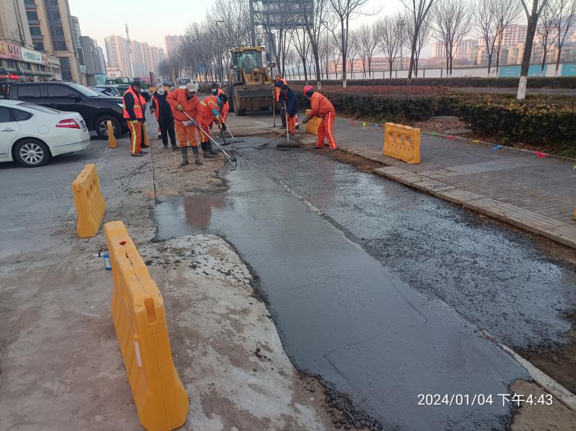 由于去年年底轄區(qū)平山路進(jìn)行電路改造,對(duì)道路路面及人行道道磚造成破壞,給行人帶來(lái)通行不便和安全隱患,為此,盛達(dá)市政公司為及時(shí)恢復(fù)行人安全出行環(huán)境,對(duì)平山路開(kāi)展整治工作。整治工作中,該公司根據(jù)工作實(shí)際情況,科學(xué)安排,精心部署,始終嚴(yán)把質(zhì)量關(guān),和天氣比賽,與時(shí)間賽跑,在供電部門(mén)完成電路改造后,第一時(shí)間進(jìn)行破損路面清除、廢舊道磚拆除、布設(shè)圍擋等清障保通工作,于今年一月初進(jìn)行測(cè)量放線、混凝土澆筑、道磚鋪設(shè)等工作,通過(guò)養(yǎng)護(hù)人員20余天的有序作業(yè),順利完成整治工作,并做好灑水覆蓋養(yǎng)護(hù)。