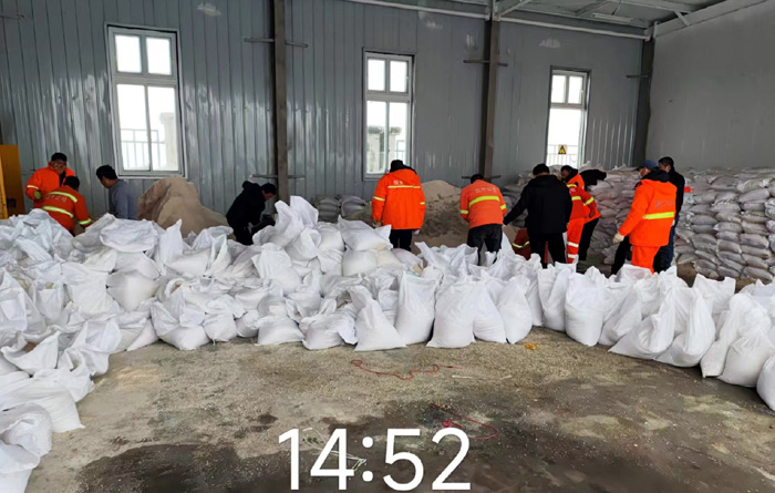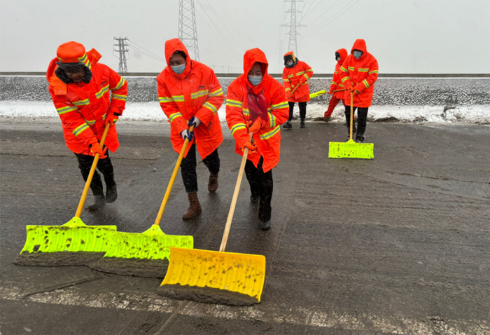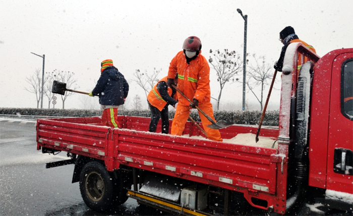 悅升公司按照責(zé)任分工,分包路段、分配任務(wù),出動除雪機械設(shè)備,夜以繼日、奮戰(zhàn)一線,緊張有序地開展道路冰雪清除工作。本次出動保障人員160余名,兵分7路,2路裝卸隊負責(zé)將提前采購好的200多噸融雪劑有序裝車,5路道路保障隊負責(zé)各自區(qū)域內(nèi)的冰雪清除。保障人員克服地面濕滑、氣溫驟降等不利因素,秉承“減存遏增”的理念,各路段按照人工+機械的方式,采取“邊下雪邊除雪”的工作模式,共出動2輛雪輥車、4輛大雪鏟車、1臺撒播機、運雪皮卡和廂貨車共11輛,循環(huán)開展除雪作業(yè),各組之間配合默契,大大提高了工作效率。