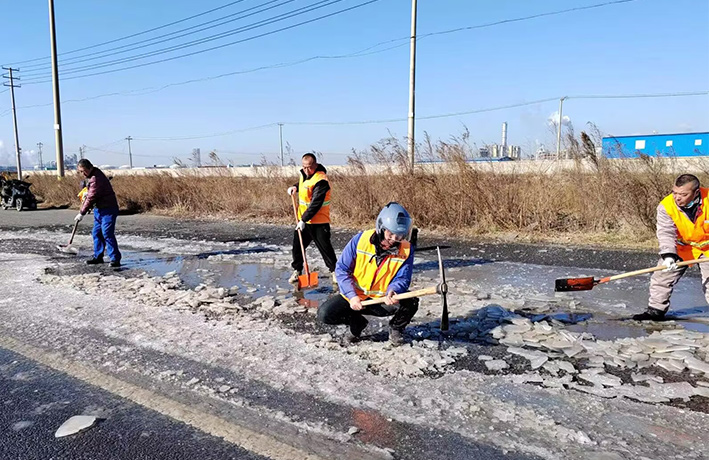 近期由于受冷空氣影響,氣溫低下,園區(qū)道路低洼積水處產(chǎn)生大面積結(jié)冰現(xiàn)象,如不及時(shí)清除,嚴(yán)重造成車輛側(cè)翻事故發(fā)生。道路排查現(xiàn)場(chǎng),管理人員及時(shí)與園區(qū)二班對(duì)接,聯(lián)合開(kāi)展“破冰保暢通”突擊活動(dòng)。大家各負(fù)其責(zé),齊心協(xié)力,揮動(dòng)手中鐵銑、羊鎬,經(jīng)過(guò)近4個(gè)多小時(shí)共同奮戰(zhàn),撬動(dòng)冰塊近400多塊,清理積水300多平方、20多處。